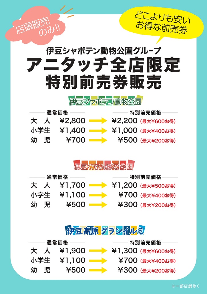 ↓↓そして、アニタッチ全店舗限定のお得情報↓↓ \どこよりも安い!/「伊豆高原グランイルミ」はもちろん、伊豆シャボテン動物公園グループのお得な前売り券を販売中♪